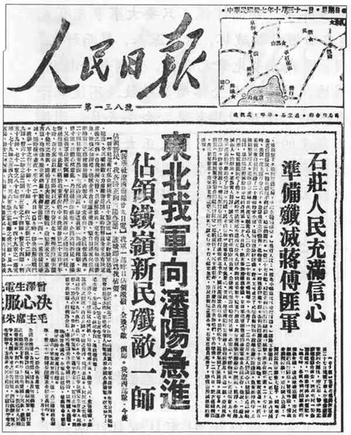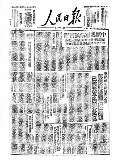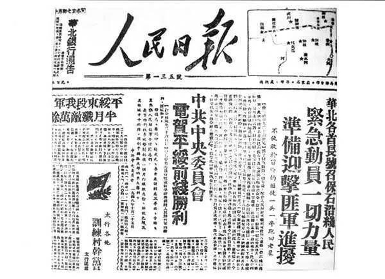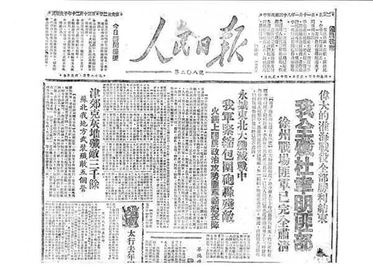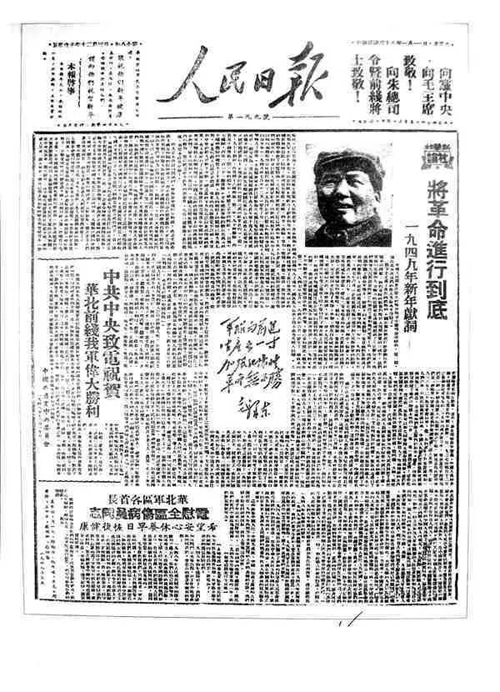 1948年12月30日,毛泽东撰写了新华社新年献辞《将革命进行到底》,号召全党全军夺取革命战争的最后胜利。献辞以几乎整版的篇幅刊登在1949年元旦的《人民日报》头版上。在头版正中,还刊登了毛泽东手书题词:“军队向前进,生产长一寸。加强纪律性,革命无不胜。”
