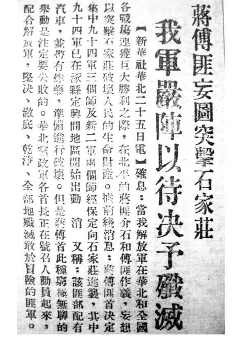 中共中央及人民解放军总部面对强敌突袭,很快做好军事部署及应变安排。同时,雄才大略的毛泽东主席亲自执笔撰写新华社电讯稿《蒋傅匪妄图突击石家庄》,刊登在10月26日的《人民日报》头版,意在告诉傅作义我军已经洞悉其阴谋。
