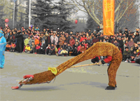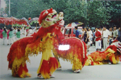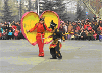 一个狮子二人表演,一前一后,每场一般1~2头狮子,一个绣球,有的狮子多达四头以上,如获鹿镇五街,大狮子两头.小狮子四头,表演起来更显得生动活泼。狮子舞主要分布在获鹿镇五街、八街、铜冶镇南铜冶等村。